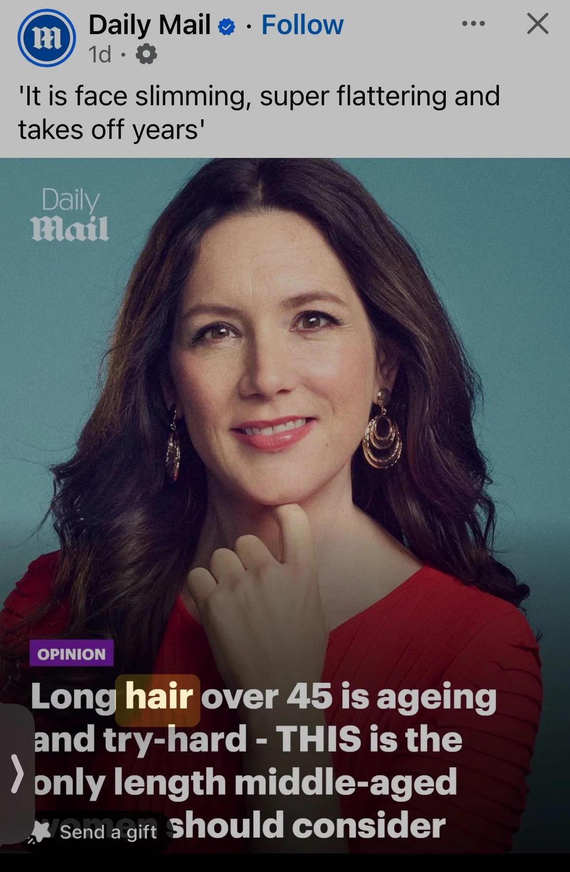 My beef is with why it’s such a horrible thing for women to age. No one is writing articles in magazines about men over 45 who wear their hair long.